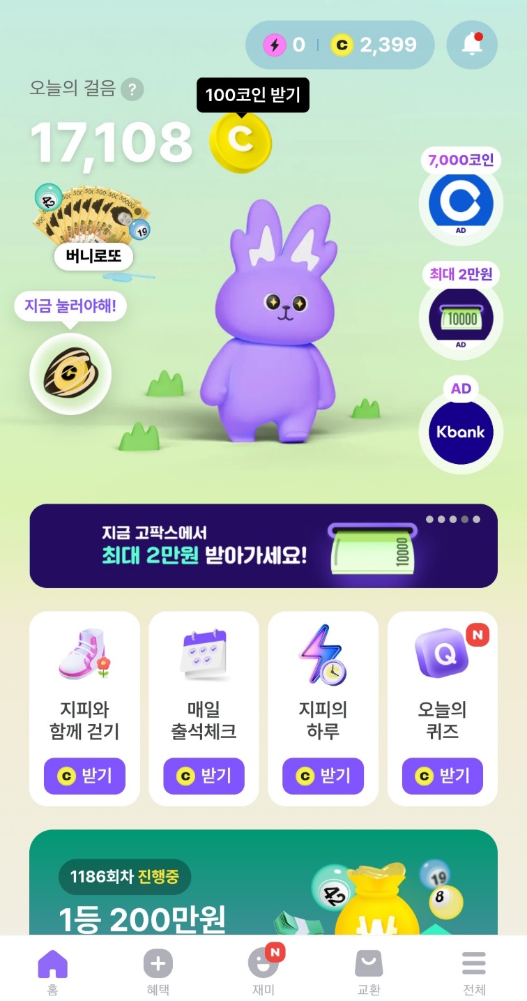 5. 비트버니 만보기와 보너스 영상으로 포인트를 모으고 역시 현금인출이 가능. 현재 포인트 : 2,399