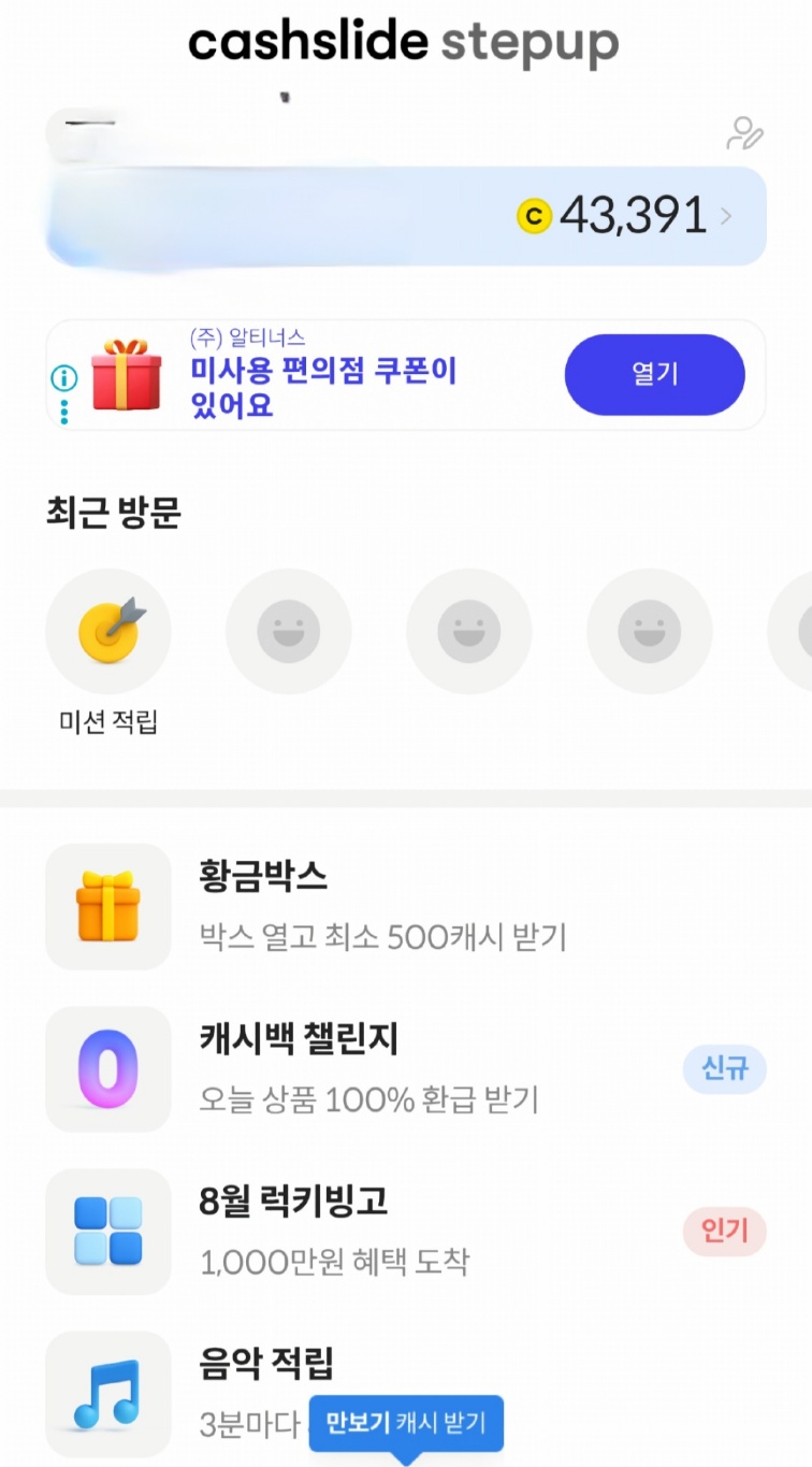 1.캐시슬라이드는 가족들과 함께 모으기를 통해 5만원이 모이면 1/10인 오천원을 내 몫으로 한다. 현재 포인트 43,391